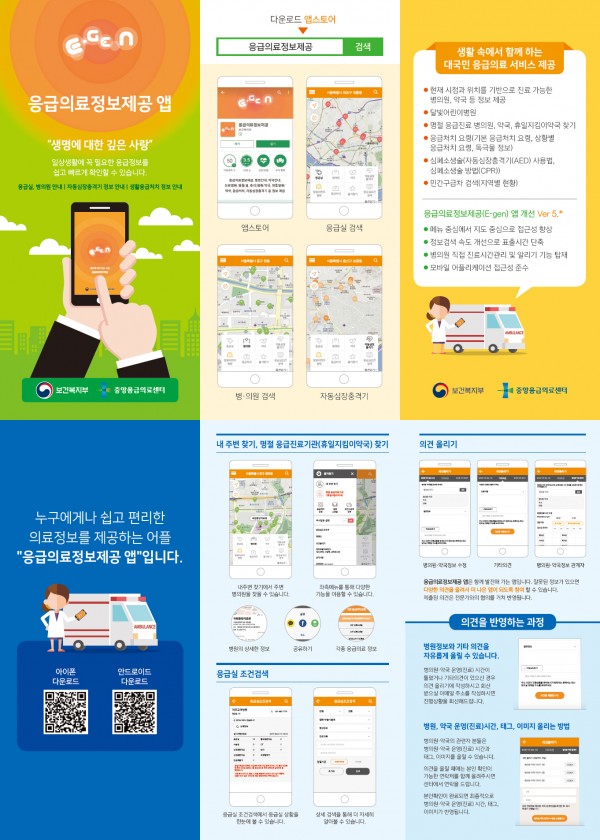 보건복지부에서는 현재 시점과 위치를 기반으로 이용가능한 의료기관 및 자동심장충격기 등 응급의료정보제공을 받을 수 있는 응급의료정보 제공 앱을 운영하고 있습니다.