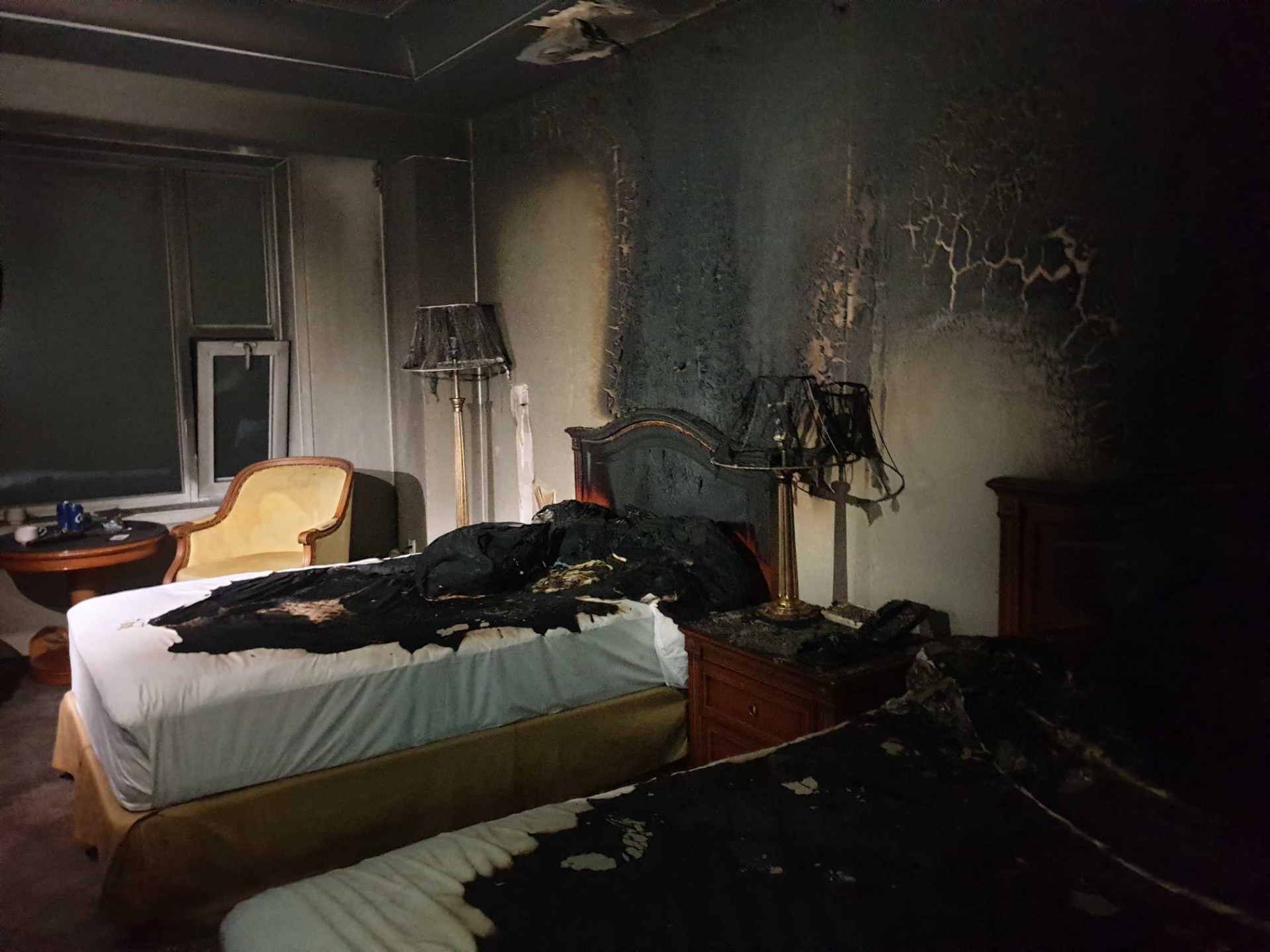 24층 높이의 호텔에서 불이 났지만 다행스럽게도 스프링클러와 화재경보기가 작동했다.