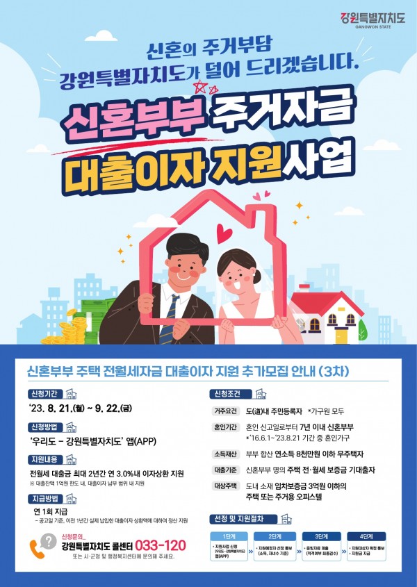 강원특별자치도 주관, 기 추진 중인 「신혼부부 주거자금 대출이자 지원사업」 신청자 모집 결과, 잔여 사업량에 발생하여 추가(3차) 모집을 진행하고자 합니다.